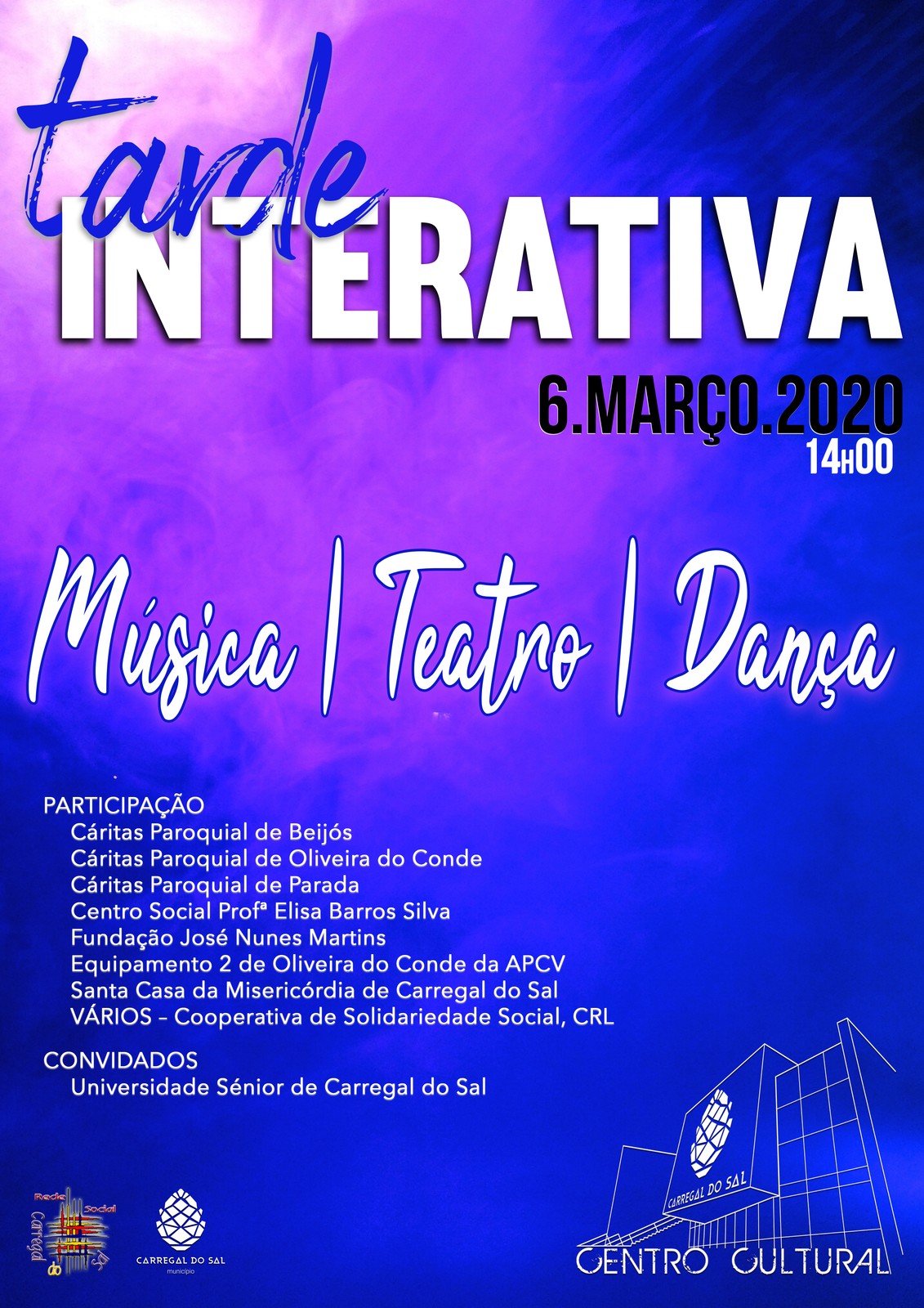Música, teatro e dança … são os ingredientes da Tarde Interativa de 2020 que, no dia 6 de março, pelas 14h00, junta, no auditório do Centro Cultural de Carregal do Sal, utentes e pessoal técnico e auxiliar das IPSS do Concelho e da Cooperativa VÁRIOS.