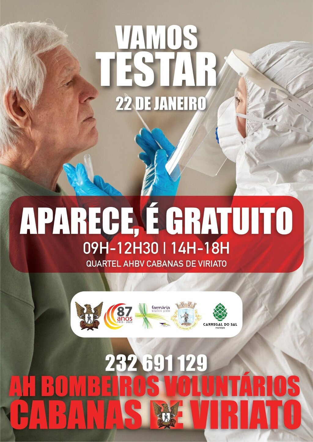 Sábado, dia 22 de janeiro, das 09:00h - 12:30h e das 14:00h - 18:00h, testagem gratuita no quartel da AH dos Bombeiros Voluntários de Cabanas de Viriato.