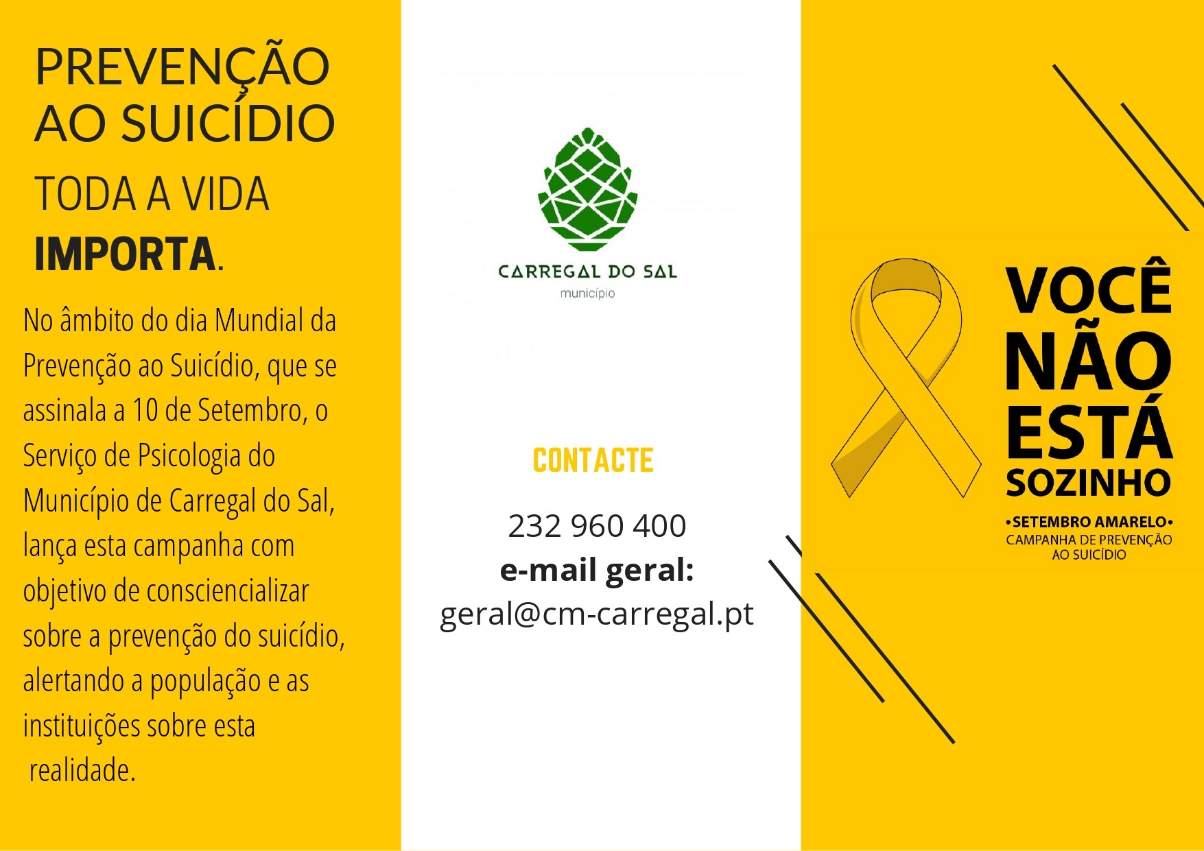 No âmbito do Dia Mundial da Prevenção ao Suicídio, que se assinala a 10 de setembro, o Serviço de Psicologia do Município de Carregal do Sal, lança esta campanha com objetivo de consciencializar sobre a prevenção do suicídio, alertando a população e as instituições sobre esta realidade.