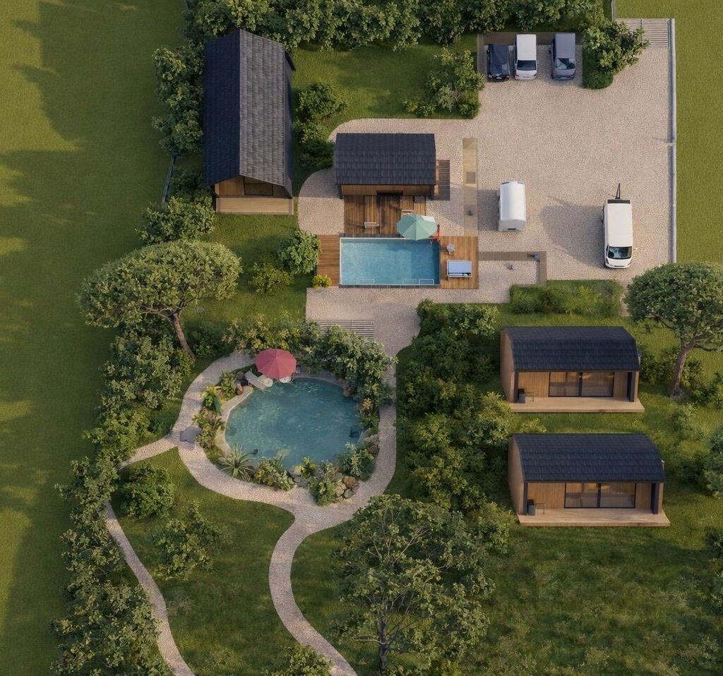 Promovido pela RSMelinda, este projeto distingue-se por um conceito inovador que privilegia a integração com a natureza e a valorização do território local. O empreendimento será composto por três unidades independentes (dois T1 e um T3) com capacidade total para até 14-16 hóspedes, proporcionando uma experiência acolhedora e diferenciadora.