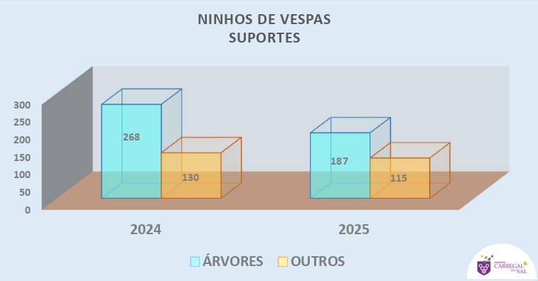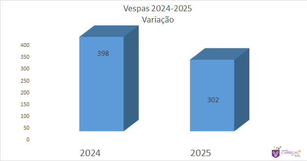 De acordo com os dados relativos a 2025, foram exterminados 302 ninhos de vespa velutina no concelho, menos 96 face ao ano anterior. A maioria das ocorrências foi registada em árvores, num total de 188 ninhos, e maioritariamente nos meses de setembro e dezembro.