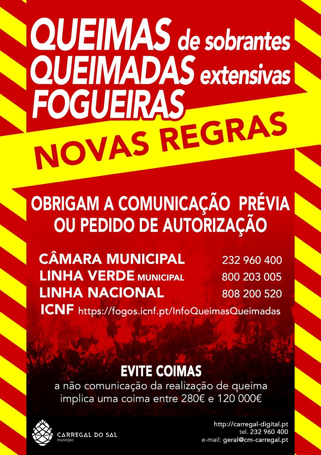 3 – Na sequência do referido no número anterior, as pessoas que pretendam realizar a queima de matos cortados e amontoados e qualquer tipo de sobrantes de exploração, terão de realizar o pedido de comunicação prévia através da plataforma do ICNF – Instituto da Conservação da Natureza e das Florestas, através do link (https://fogos.icnf.pt/InfoQueimasQueimadas/), ou, em alternativa, através dos contactos telefónicos desta Câmara Municipal – 232 960 400 e 800 203 005.