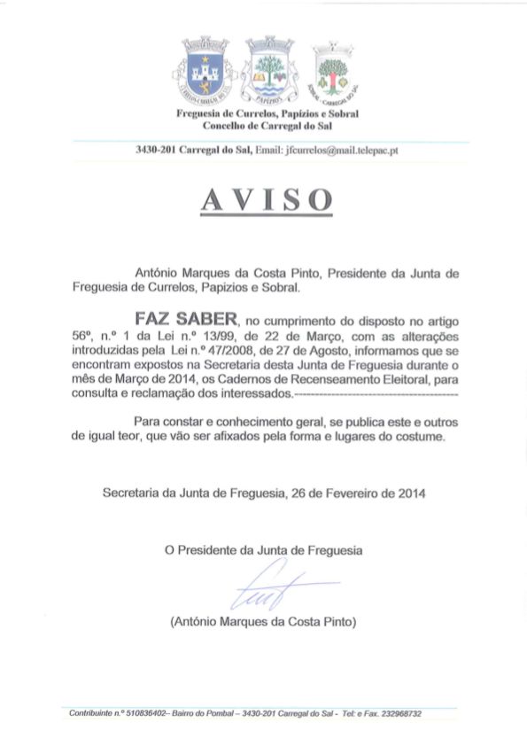 Encontram-se expostos na Secretaria da Junta de Freguesia de Currelos, Papízios e Sobral durante o mês de março.