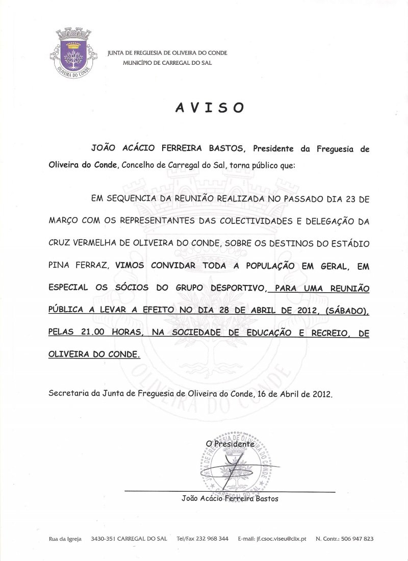 Reunião pública a levar a efeito no dia 28 de abril pelas 21h00, na Sociedade de Educação e Recreio, sobre os destinos do Estádio Pina Ferraz.
