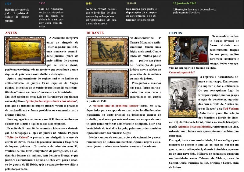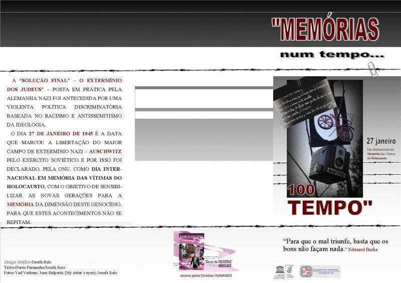 Assim, nesse contexto, convidamos o observador a visitar a exposição em epígrafe, que tem como objetivo central evocar o dia 27 de janeiro de 1945, dia em as tropas soviéticas libertaram de Auschwitz cerca de 7 mil prisioneiros, entre estes 500 crianças. Este dia foi consagrado pela ONU como Dia Internacional em Memória das Vítimas do Holocausto.